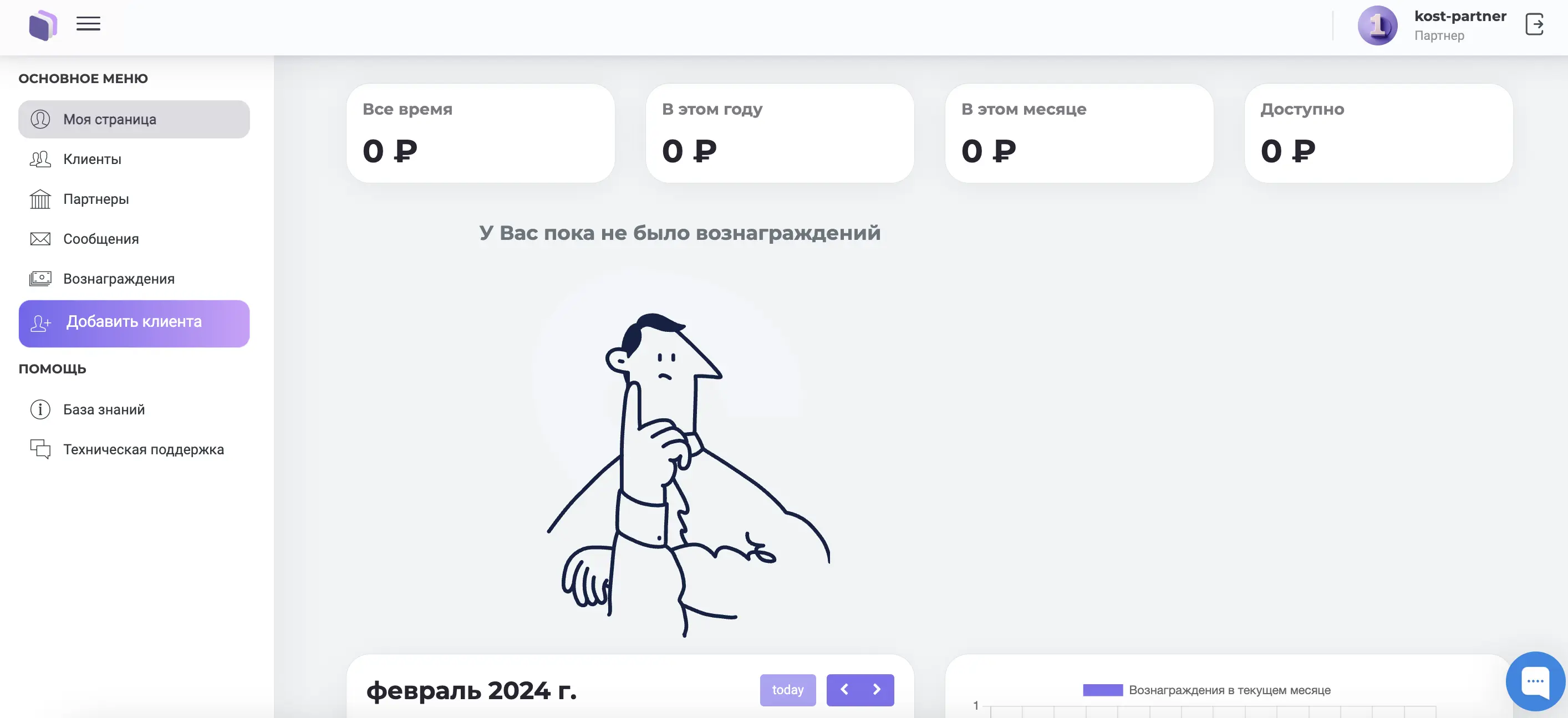 Левая панель меню: Здесь вы найдете все необходимые разделы для эффективной работы. Для начала вашего партнерства с компаниями перейдите в раздел "Партнеры".