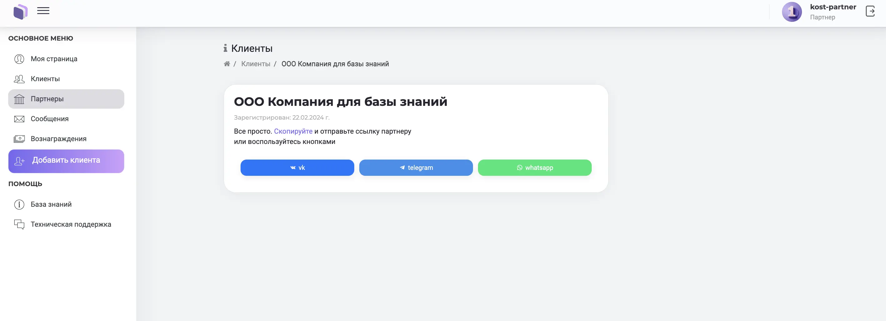 Добавление клиентов (лидов): После установления партнерства вы сможете добавлять клиентов. Перейдите в раздел меню "Добавить клиента" и заполните необходимую информацию о клиенте, указаа такие данные как: название компании, имя представителя и их контактные данные. Если необходимо оставьте комментарий о том, что нужно клиенту.